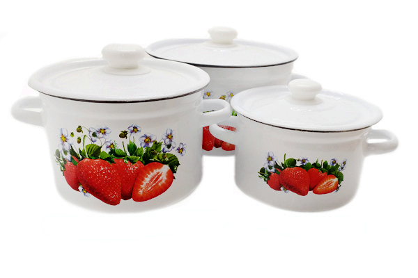 Набор эмалированный 272 Клубничная симфония представлен тремя цилиндрическими кастрюлями с крышкой.
