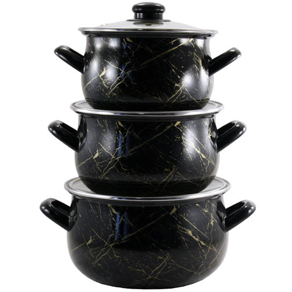 Набір емальований 700 Чорний мармур складається з трьох сферичних каструль різного об’єму. Він екологічний, довговічний та має стильний дизайн.